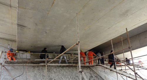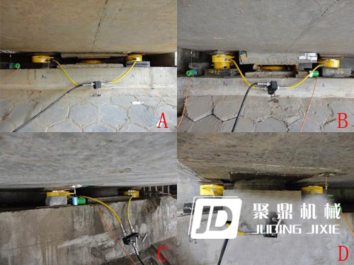首先我司工作人員對鎮(zhèn)江路段橋梁的跨距、每跨的梁片數(shù)、梁片的結(jié)構(gòu)形式以及橋梁的高度進行現(xiàn)場現(xiàn)場勘察。并查看相關(guān)圖紙核實橋梁縱向連續(xù)梁片數(shù),從而初步計算出梁體重量及荷載能力。然后經(jīng)過測量梁片與墩臺之間的實際距離,研究放置千斤頂?shù)奈恢眉芭R時支撐位置。討論現(xiàn)場施工操作人員、觀察人員的位置以及整個施工環(huán)境。