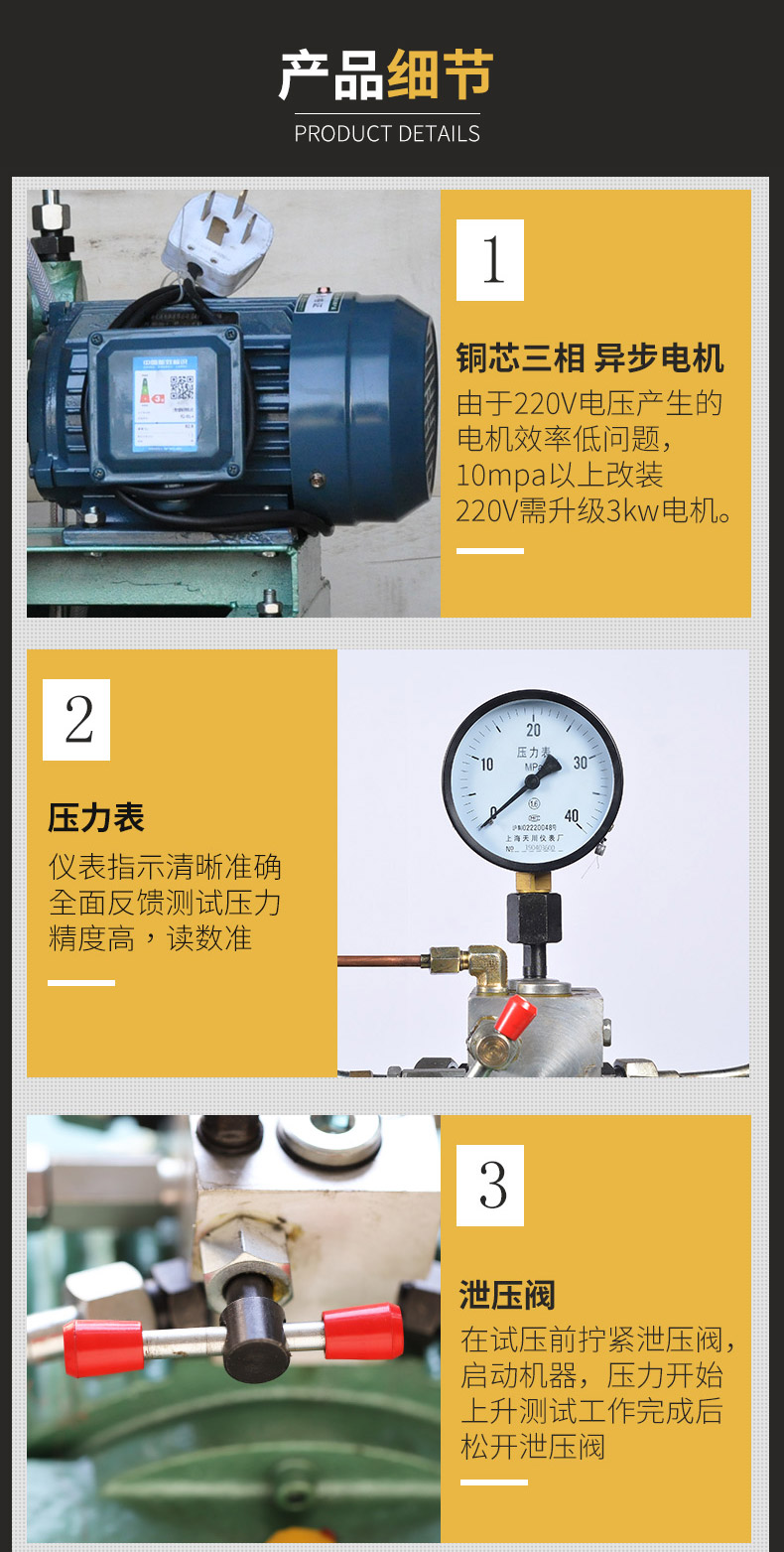 用途:供各類壓力容器、管道、鍋爐、鋼瓶、閥門、消防器材作實(shí)驗(yàn)室和水壓試驗(yàn)中獲得高壓液體的理想設(shè)備